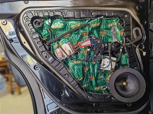 首先前后車門,先用大能超級盾將車門內外鈑金做雙層隔音處理,再用吸音棉給飾蓋做吸音處理,做完隔音,讓整個門板成為一個密封的箱體,提升喇叭的效果,也能提升車門鈑金厚度。