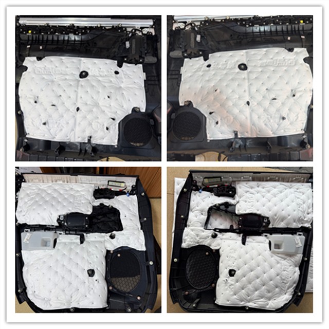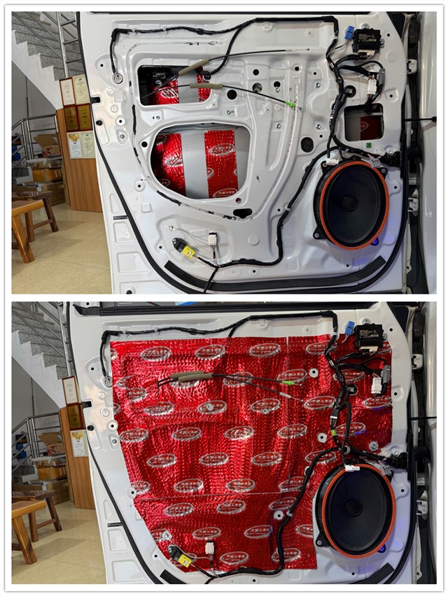 門(mén)板最容易受到外界噪音的影響,像風(fēng)噪和共振,大多就是通過(guò)這里傳進(jìn)來(lái)的。為了改善這一情況,改裝師先在門(mén)板貼上雙層大能紅派隔音材料。強(qiáng)化鈑金結(jié)構(gòu),減少因震動(dòng)帶來(lái)的噪音。接著,又在門(mén)板飾蓋上粘貼一層大能溫莎吸音棉。這種吸音棉是用柔軟而高密度的材料制成的,能有效吸收中高頻的雜音。兩種材料搭配使用,能大大提升門(mén)板的隔音效果,讓車(chē)內(nèi)環(huán)境更加安靜、舒適。