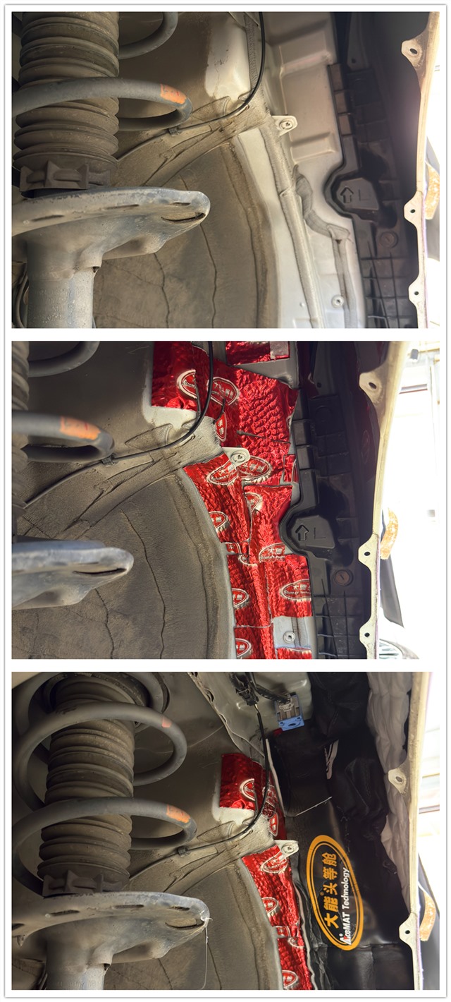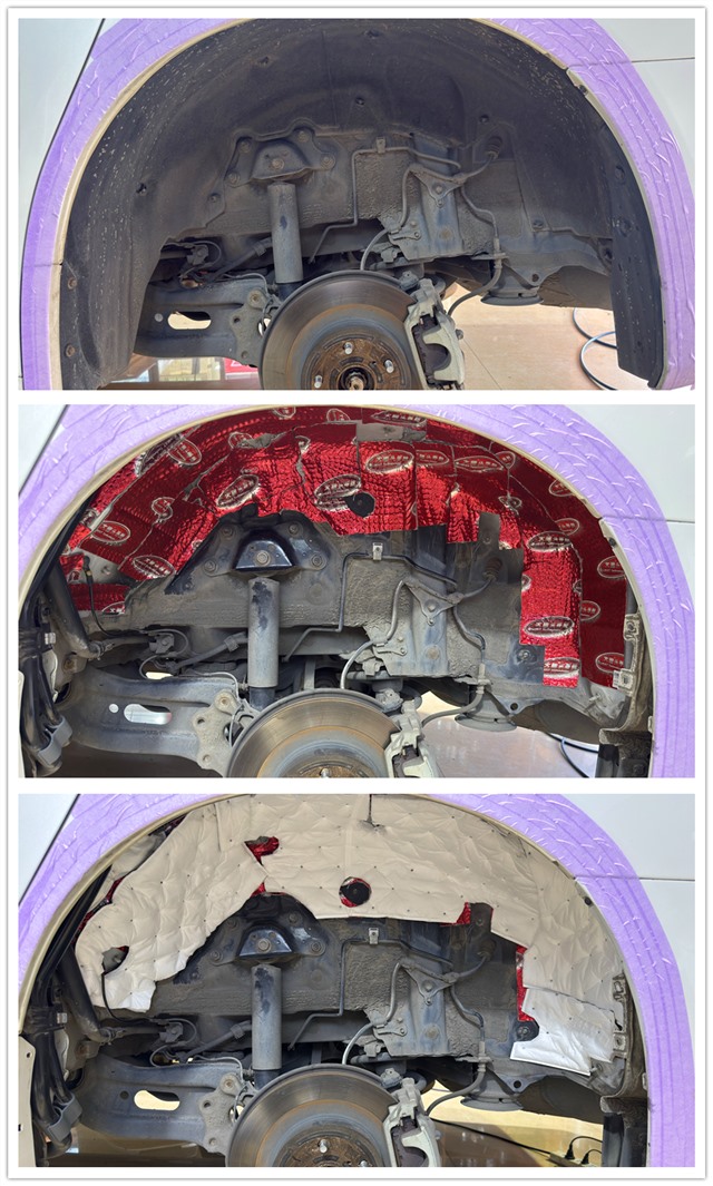 汽車(chē)在高速行駛或經(jīng)過(guò)路面粗糙時(shí),胎噪更為明顯。為有效降低胎噪,改裝師在四個(gè)輪弧內(nèi)側(cè)貼合了大能隔音材料。可以增強(qiáng)輪弧結(jié)構(gòu)的剛性,從而有效抑制共振和滾動(dòng)噪音的傳入。在安裝過(guò)程中,根據(jù)每個(gè)輪腔的曲面結(jié)構(gòu),精細(xì)裁剪并彎折材料,使其嚴(yán)密貼合鈑金表面,確保無(wú)空鼓、無(wú)翹邊,最大限度發(fā)揮材料的隔音減震效果。
