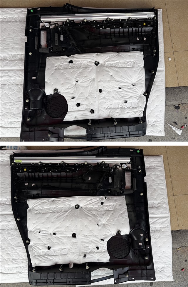 原車門板內部結構簡陋,只是一層薄塑膠紙,起不到隔音作用