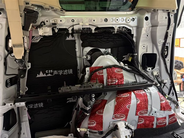 尾箱是一個巨大的空腔,極易產生共鳴和放大來自后部的噪音。我們對整個尾箱底層,包括后翼子板兩側,都實施了 紅派+噪音終結者 的雙層隔音工藝。此舉極大地消除了后備箱的共鳴效應,并使來自后輪轂的噪音得到顯著抑制。