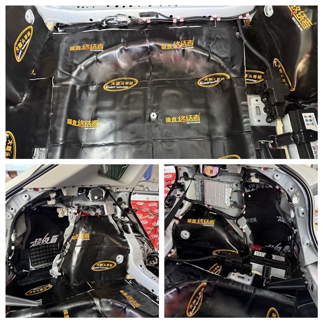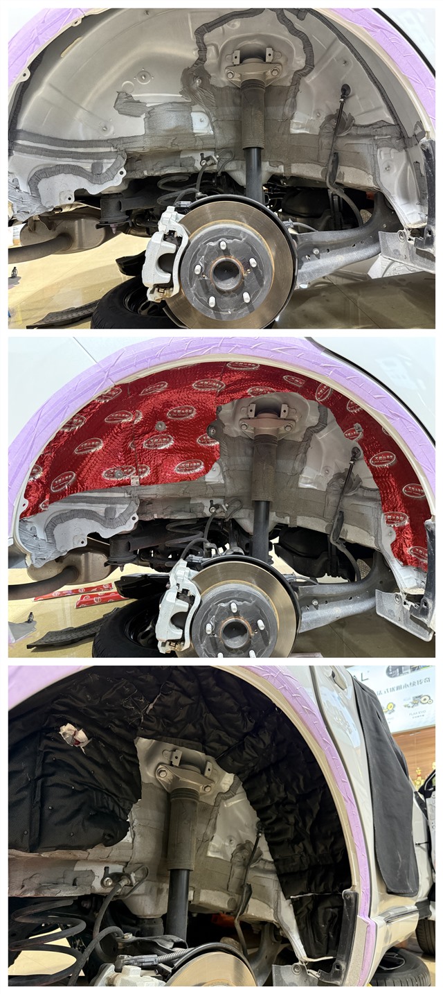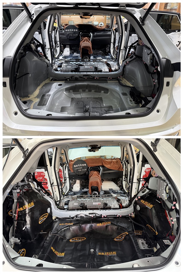 底盤與尾箱是整車噪音傳遞的核心通道,技師將車體相關部位徹底拆解,露出原生鈑金。對比施工前后的狀態,原車幾乎無有效隔音措施,而升級后,底盤與尾箱均鋪設大能紅派隔音與超級蕰莎,雙層防護有效抑制鈑金共振,阻隔路噪與尾排噪音。